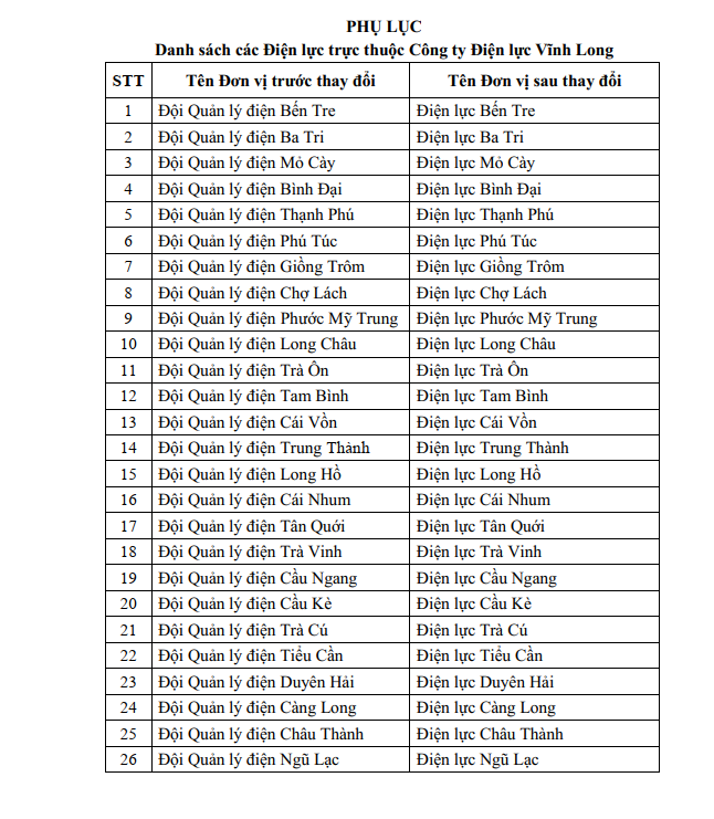 Thông báo về việc đổi tên các đơn vị trực thuộc Công ty Điện lực Vĩnh Long (Xem file đầy đủ tại đây)
